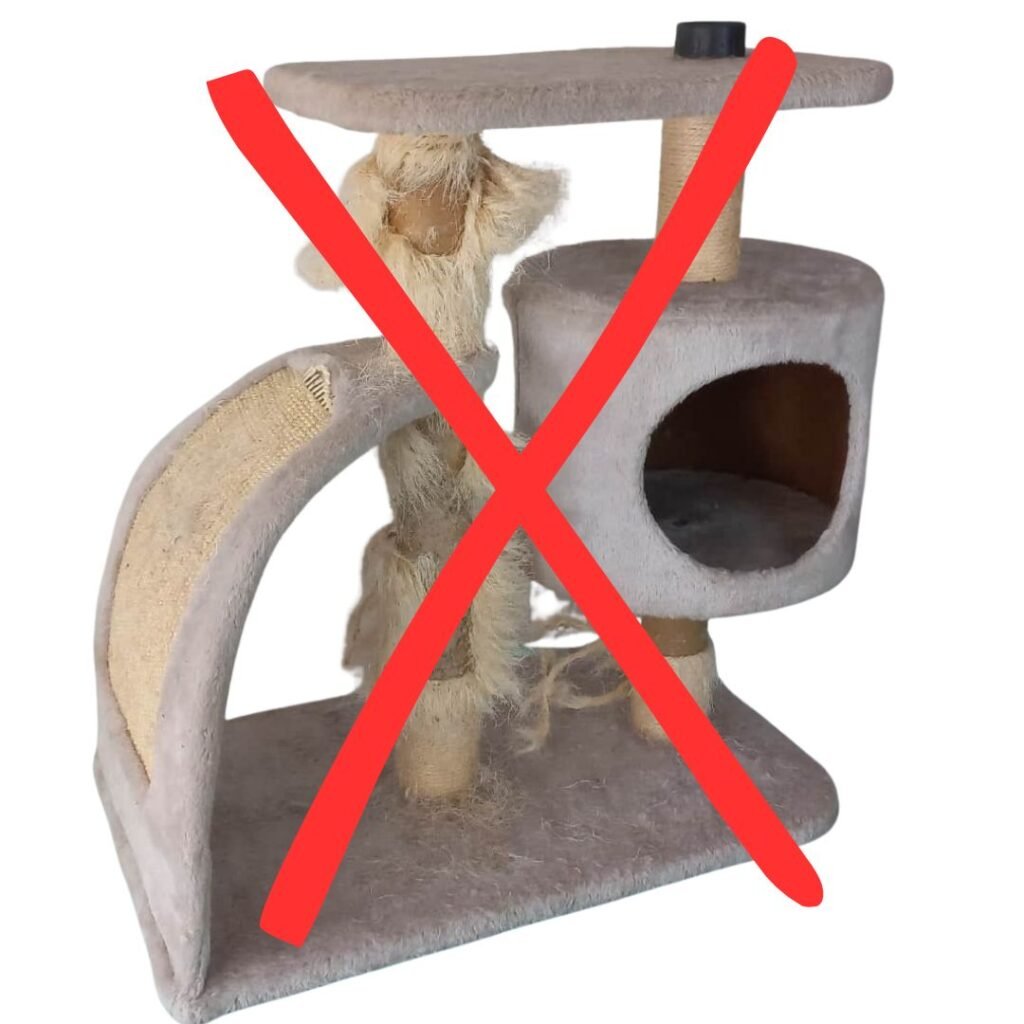 Los rascadores de peluche como el de la imagen acumulan ácaros del polvo en la moqueta y el relleno desde el primer mes, ya que su superficie porosa atrapa caspa, pelo y humedad, creando un caldo de cultivo ideal para alérgenos que provocan picor, estornudos y dermatitis en gatos sensibles. El aglomerado se hincha con la mínima humedad, los hilos de sisal se desprenden y pueden causar obstrucción intestinal si el gato los ingiere, y los pegamentos industriales liberan compuestos volátiles durante meses. En 6-12 meses el olor a amoniaco es inevitable, la estructura se tambalea y el conjunto termina en la basura sin posibilidad de reciclaje.